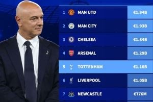 5、热刺,11亿欧元
