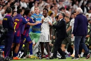 体育资讯10月27日讯 西甲国家德比,皇马主场2-1巴萨,5分优势领跑积分榜。本场比赛双方发生大规模冲突,卢宁在替补席染红,多人染黄。