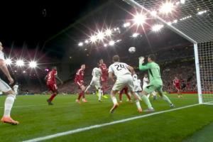 体育资讯11月05日讯 利物浦vs皇马第47分钟,范戴克近距离头球,又被库尔图瓦神反应挡出!